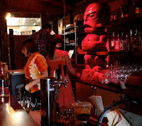 The main bar, overseen by the the three Marquesan Baby Eaters from the original Portland Kon-Tiki
